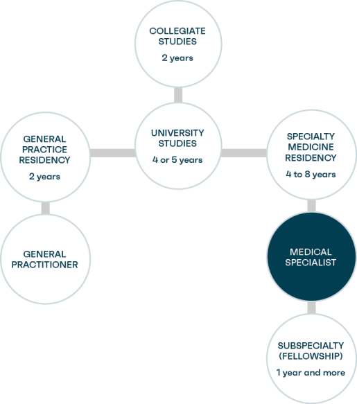 After CEGEP, it takes 4 to 5 years to obtain a doctorate in medicine. The residency then takes 4 to 8 years, at the end of which the future medical specialist must complete a postgraduate internship before being allowed to practice their profession.