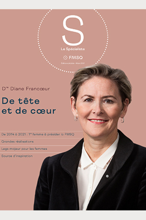 Pour souligner le départ de la Dre Diane Francoeur, une édition hors série du magazine Le Spécialiste est publiée à l'occasion de la Journée internationale des femmes. Un portrait inédit de la première femme élue à la présidence de la FMSQ